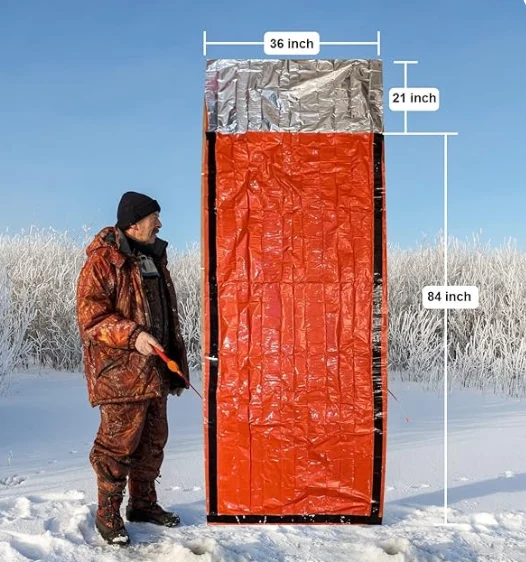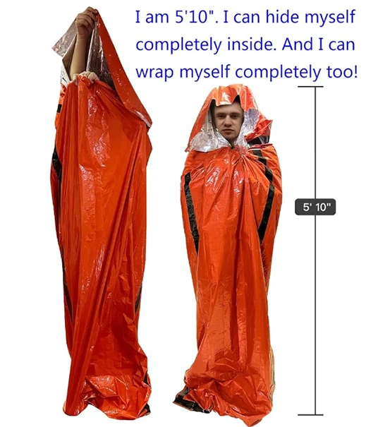 എമർജൻസി അതിജീവന സ്ലീപ്പിംഗ് ബാഗിന് നിങ്ങളുടെ എല്ലാ കാലാവസ്ഥയിലും എല്ലാ സീസണുകളിലും എല്ലാ സാഹചര്യങ്ങളിലും അതിജീവനത്തിനുള്ള സാധ്യത വർദ്ധിപ്പിക്കാൻ കഴിയും. ബഹിരാകാശ പരിശോധനയ്ക്കായി നാസ രൂപകൽപ്പന ചെയ്ത മൈലാർ മെറ്റീരിയൽ ഉപയോഗിച്ചാണ് ഇത് നിർമ്മിച്ചിരിക്കുന്നത്. ഇത് ശരീര താപത്തിന്റെ 90% തിരികെ നിലനിർത്തുന്നു / പ്രതിഫലിപ്പിക്കുന്നു. ഇത് വീണ്ടും ഉപയോഗിക്കാവുന്ന, വാട്ടർപ്രൂഫ്, വിൻഡ്പ്രൂഫ് എന്നിവയാണ്.