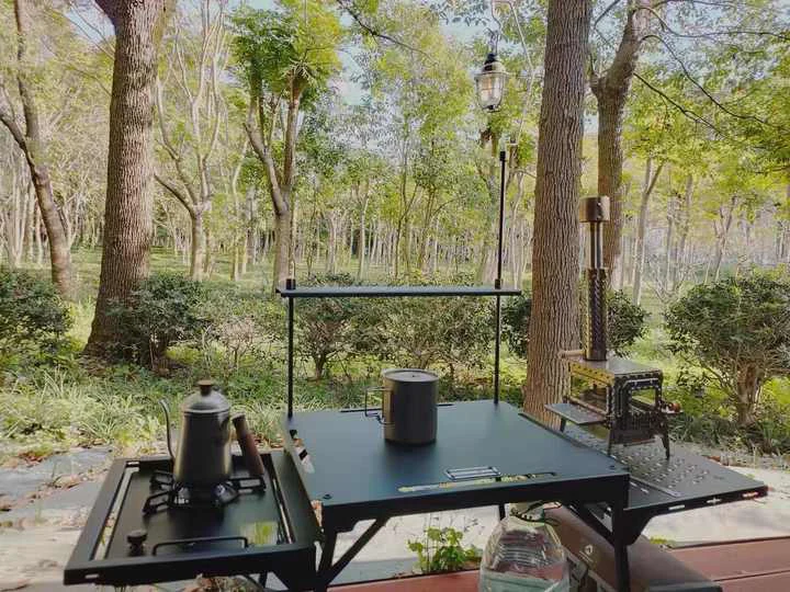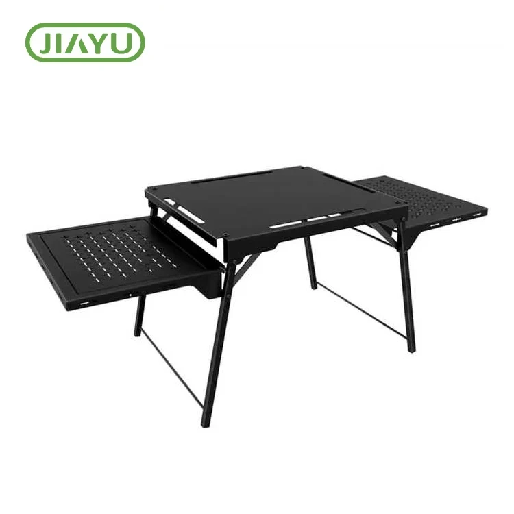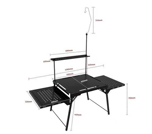 പോർട്ടബിൾ മടക്കാവുന്ന അലുമിനിയം-ഇരുമ്പ് ക്യാമ്പിംഗ് പട്ടിക, ഡൈനിംഗ് ടേബിൾ പ്ലാറ്റ്ഫോം മുകളിലെ, മധ്യ, താഴ്ന്ന ഭാഗങ്ങൾ എന്നിവ ഉൾക്കൊള്ളുന്നു, എല്ലാത്തരം ടേബിക്ഷവും ഭക്ഷണവും മസാലകളും സംഭരിക്കുന്നതിന് മതിയായ ഇടം.